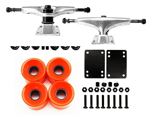 Skateboard Truck and Wheel, 5.0 Skateboard Trucks (Silver) w/Skateboard Crusier Wheel 60mm, Skateboard Bearings, Skateboard Screws, Skateboard Riser Pads (Orange)